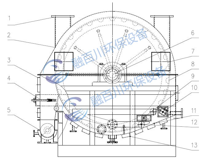1.除塵口;2.罩殼;3.視窗;4.刮刀系統(tǒng);5.輸送絞龍;6.軸承及軸承座;7.側(cè)面視窗;8.轉(zhuǎn)鼓;9.側(cè)刮刀;